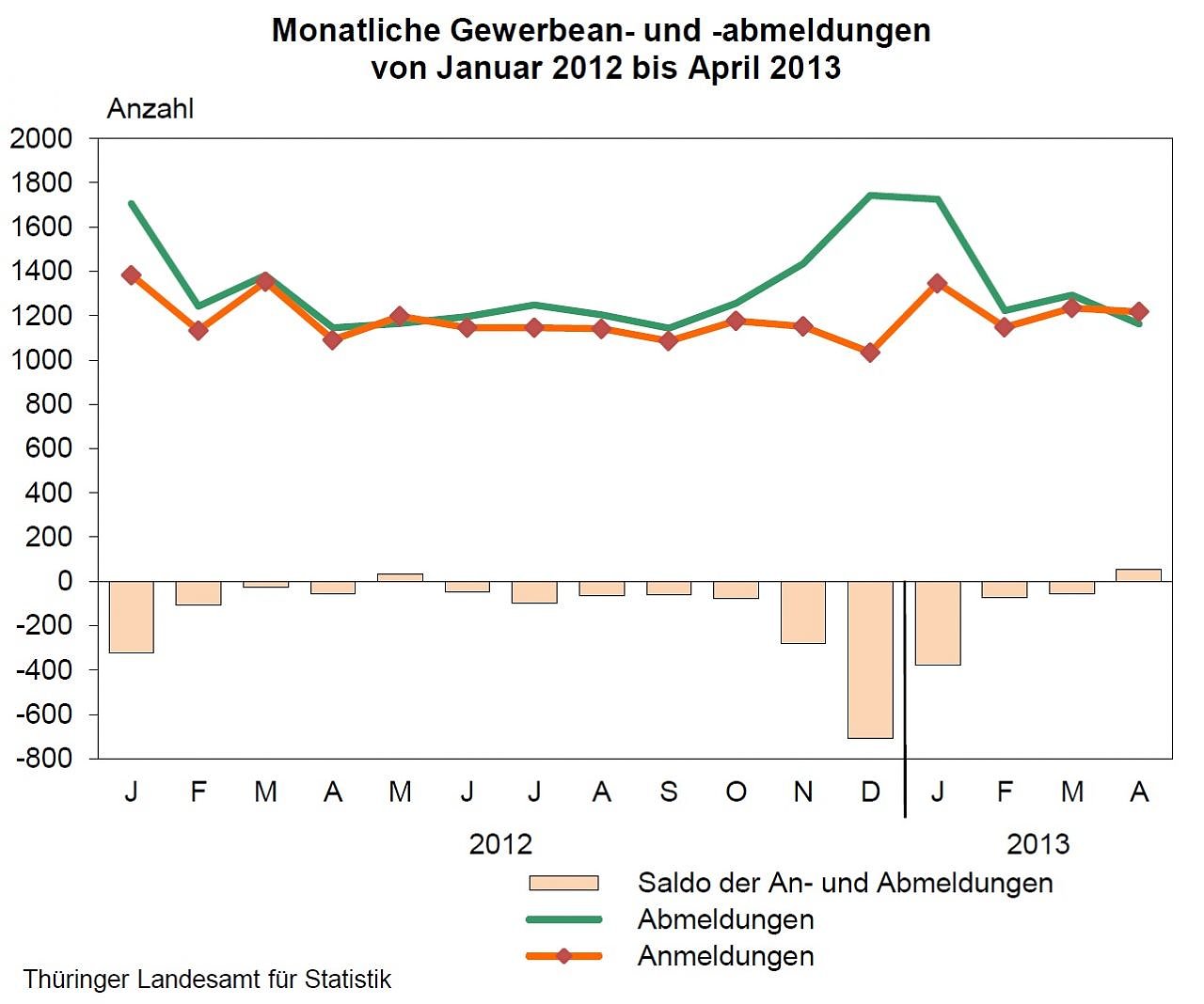Nach Mitteilung des Thüringer Landesamtes für Statistik verringerte sich die Anzahl der Gewerbeanmeldungen um 13 auf 4 946 Anzeigen (- 0,3 Prozent), die der Gewerbeabmeldungen um 70 bzw. 1,3 Prozent auf 5 404 Anzeigen.