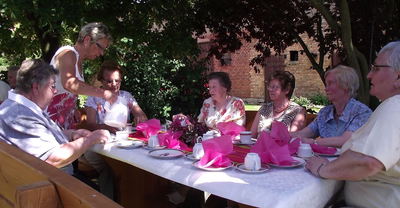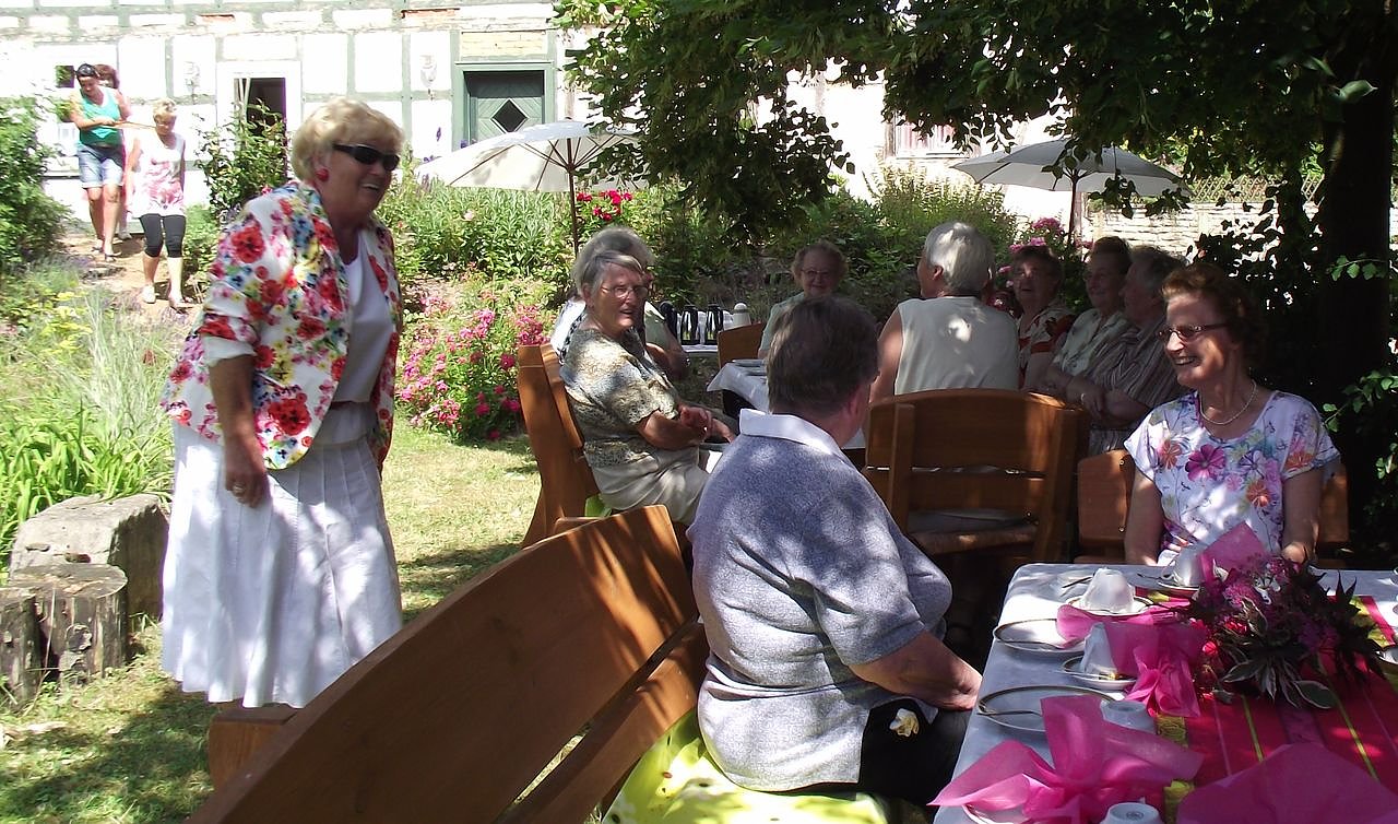 Dieser Tage erfolgte das Juli-Kränzchen. Auf dem Hof unter Linden. Gleich neben einem Teich mit herrlichen Seerosen. Im Bild links Ilona Mückenheim. Zur guten Tradition gehört, den Frauen zu gratulieren, die im jeweiligen Monat Geburtstag hatten. Diesmal war Ingrid Steinmüller an der Reihe, die 65 wurde. Zu den Helferinnen, welche die Seniorinnen bedienten, gehörten Viola Just, die stellvertretende Bürgermeisterin (im Bild bei der Bedienung) und Andrea Schmiedekind, die Krankenschwester.