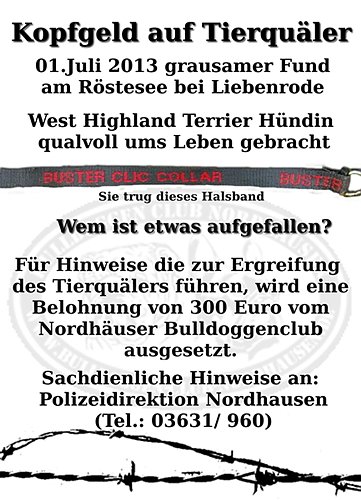 Neben der erhöhten Belohnung startet der Nordhäuser Bulldoggenclub jetzt auch eine Plakataktion. Auf dem Plakat sind nochmals alle wichtigen Fakten zum Fall der qualvoll ums Leben gekommen Westi-Hündin nachzulesen und auch das Halsband, ist abgebildet. Jeder der die Möglichkeit hat, das Plakat aufzuhängen, kann es per Mail an bulldoogen-club-nordhausen@gmx.de und auf der Facebook-Seite des Bulldoggenclubs anfordern oder auf der Startseite der Homepage unter www.bulldoggen-club-nordhausen.de zum Ausdrucken herunter laden.