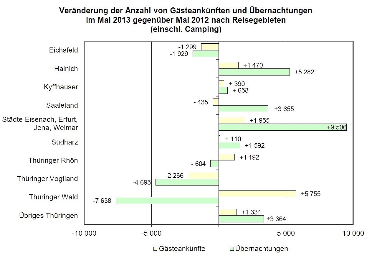 Die gut 66.000 Gästebetten der Thüringer Beherbergungsstätten waren im Mai 2013 durchschnittlich zu 43,8 Prozent ausgelastet. Die höchste Auslastung erzielte das Reisegebiet Hainich mit 54,6 Prozent, die niedrigste Auslastung war mit 30,0 Prozent im Reisegebiet Thüringer Vogtland zu verzeichnen.