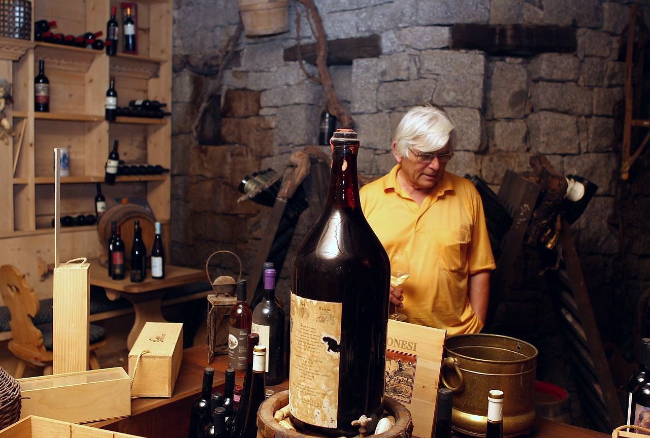 Zurück aber zum Hotel des Hans Inderst und zu dem Abend, da es in den Weinkeller ging. Es ist der tiefste Punkt des Hotels, das in den zurückliegenden Jahrzehnten immer wieder erweitert, immer moderner wurde und doch den familiären Charme nicht einbüßte. Obwohl das Gebäudeensemble an einem Hang liegt, könnte man in diesem Keller - wenn man noch 1,50 Meter gräbt - auf Grundwasser stoßen. Hier gibt es keine Temperaturschwankungen. Beim Ausbau des Kellers wurde das verbaut, was nach Meinung des Hans Inderst zu seiner Heimat, zu Südtirol gehört. Alte Holzbalken mit Malereien aus dem frühen 17. Jahrhundert. Mit Steinen aus einem ehemaligen Bruch wurde gemauert - ewig gewordene Erinnerungen. An den Wänden hänge Bilder Südtiroler Künstler, zum Beispiel von Albert Stolz.
