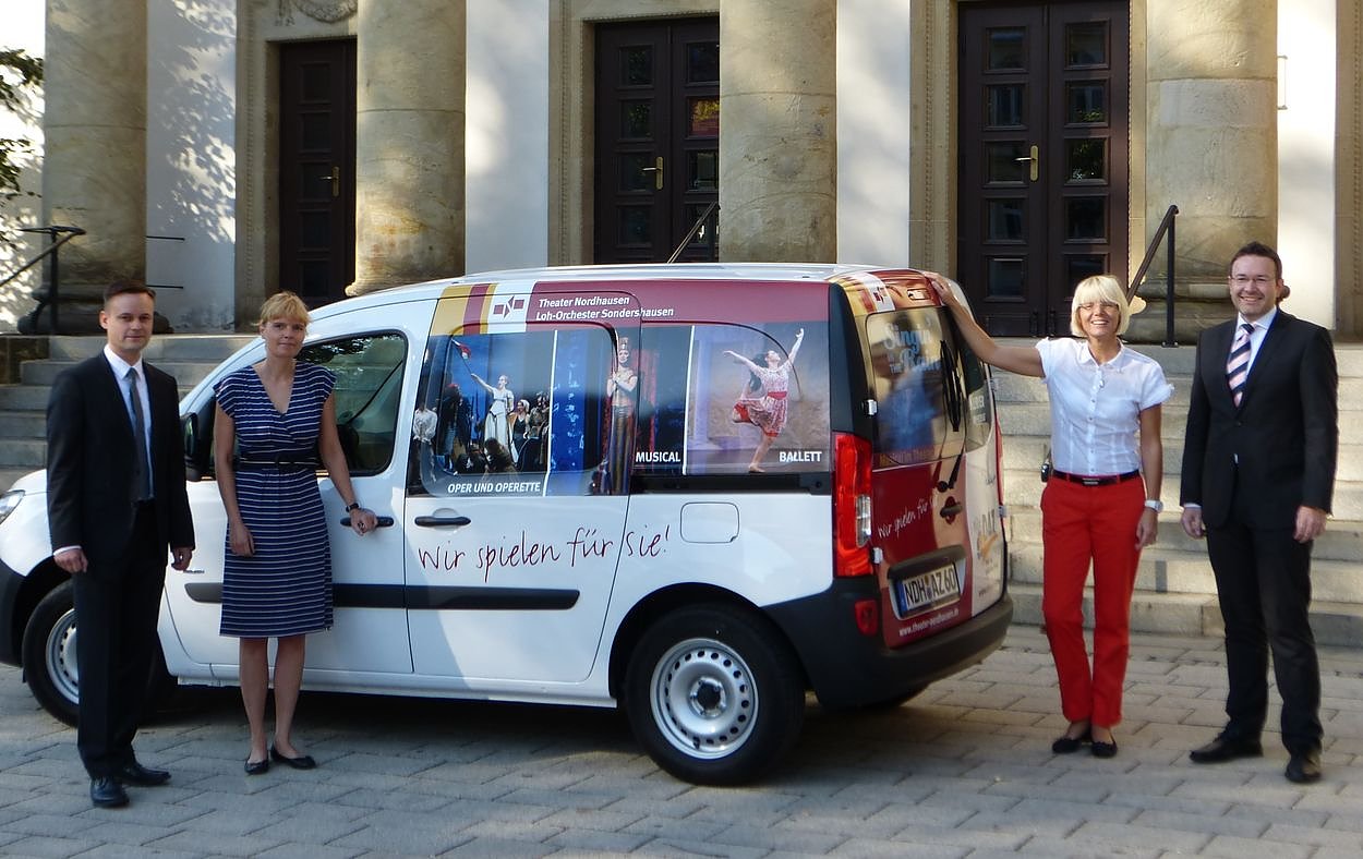 Angela Kalms, Verwaltungsdirektorin des Theaters Nordhausen, zeigte sich sehr erfreut über das Auto in den Theaterfarben. Wir waren total überrascht von der genialen Idee, erinnert sie sich an das Angebot. Wo unser Publikum wohnt, sind Sie mit Ihrem Zustellbereich zu Hause. Wir sind sehr dankbar für diese Möglichkeit, auf uns aufmerksam zu machen.