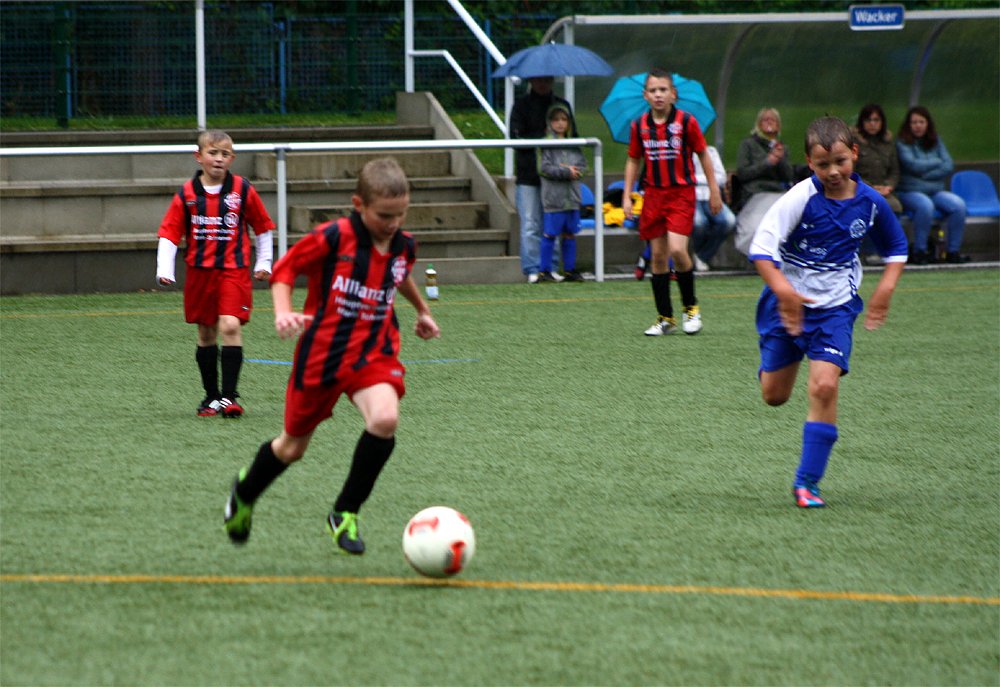 Nils Kruse konnte nur mit unfairen Mitteln vom Ball getrennt werden. Der Schiri hatte das Foul im Strafraum gesehen und gab den fälligen Neunmeter. Der Gefoulte selbst schritt zur Tat, konnte aber Luca Bendel im Kasten der E1 nicht überwinden. Der parierte zwar den Schuß des "großen" Nils, war beim Nachschuß des heranstürmenden Maximilian Grebing aber chancenlos. Anschlußtreffer der E2 in der 23. Spielminute. Gleichzeitig auch der Pausenstand im herbstlichen Dauerregen.