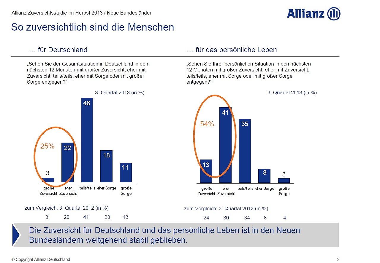 Die Einschätzung des Arbeitsmarkts bleibt dagegen stabil: 22 Prozent der Menschen im Osten schätzen die Arbeitsplätze in Deutschland als sicher ein. Das ist ein Prozentpunkt mehr als im Spätsommer 2012. Die Zuversicht für die Qualität der Schulen und Universitäten hält sich ebenfalls auf dem Stand des Vorjahreszeitraums: 29 Prozent der Ostdeutschen erwarten Fortschritte im Bildungssystem (plus ein Prozentpunkt). Das ist das zweitbeste Ergebnis seit Beginn der Erhebungen zur Allianz Zuversichtsstudie.