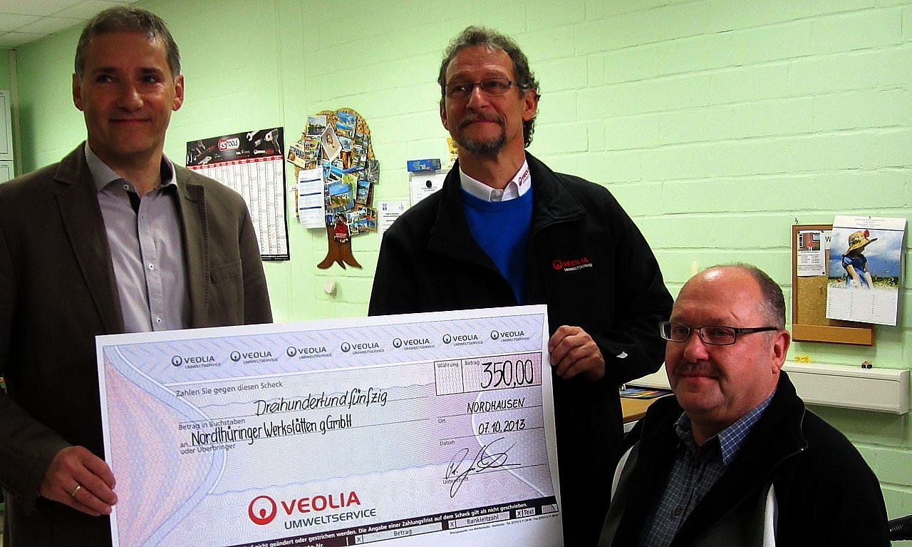 Autor: nnzHeute erfolgte die Übergabe eines Spendenchecks in Höhe von 350 Euro von der Firma Veolia an den Werkstattleiter der Nordthüringer Werkstätten, Karsten Sochurek (links) und den Vorsitzenden des Werkstattrates, Udo Dahlmann. Das Geld wird verwendet zur Finanzierung von arbeitsbegleitenden Maßnahmen und für die berufliche Bildung. Die Beschäftigten bedanken sich.