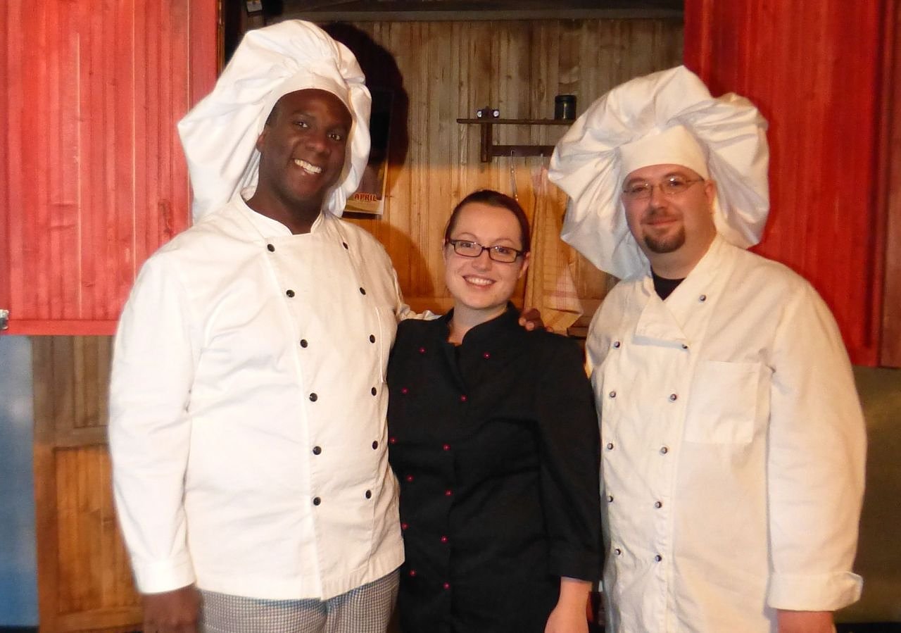 Autor: redVon links: Marvin Scott (Opernchor), Melanie und Tino Pantosch vom Theaterrestaurant Da Capo vor dem Würstchenwagen, der in Der Vogelhändler eine entscheidende Rolle spielt.
