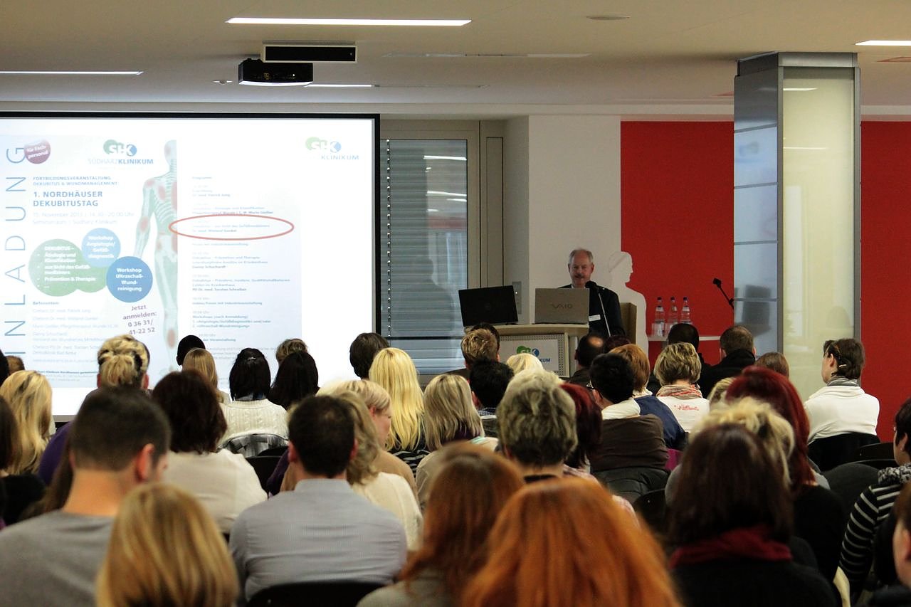 Über 100 Pflegefachkräfte und Mediziner aus der Region und angrenzenden Bundesländern nahmen an dieser Veranstaltung teil und wurden nach der Eröffnung durch Dr. Patrick Jung von Mario Gießler in die Entstehung und Klassifizierung der Dekubitalgeschwüre eingeführt.