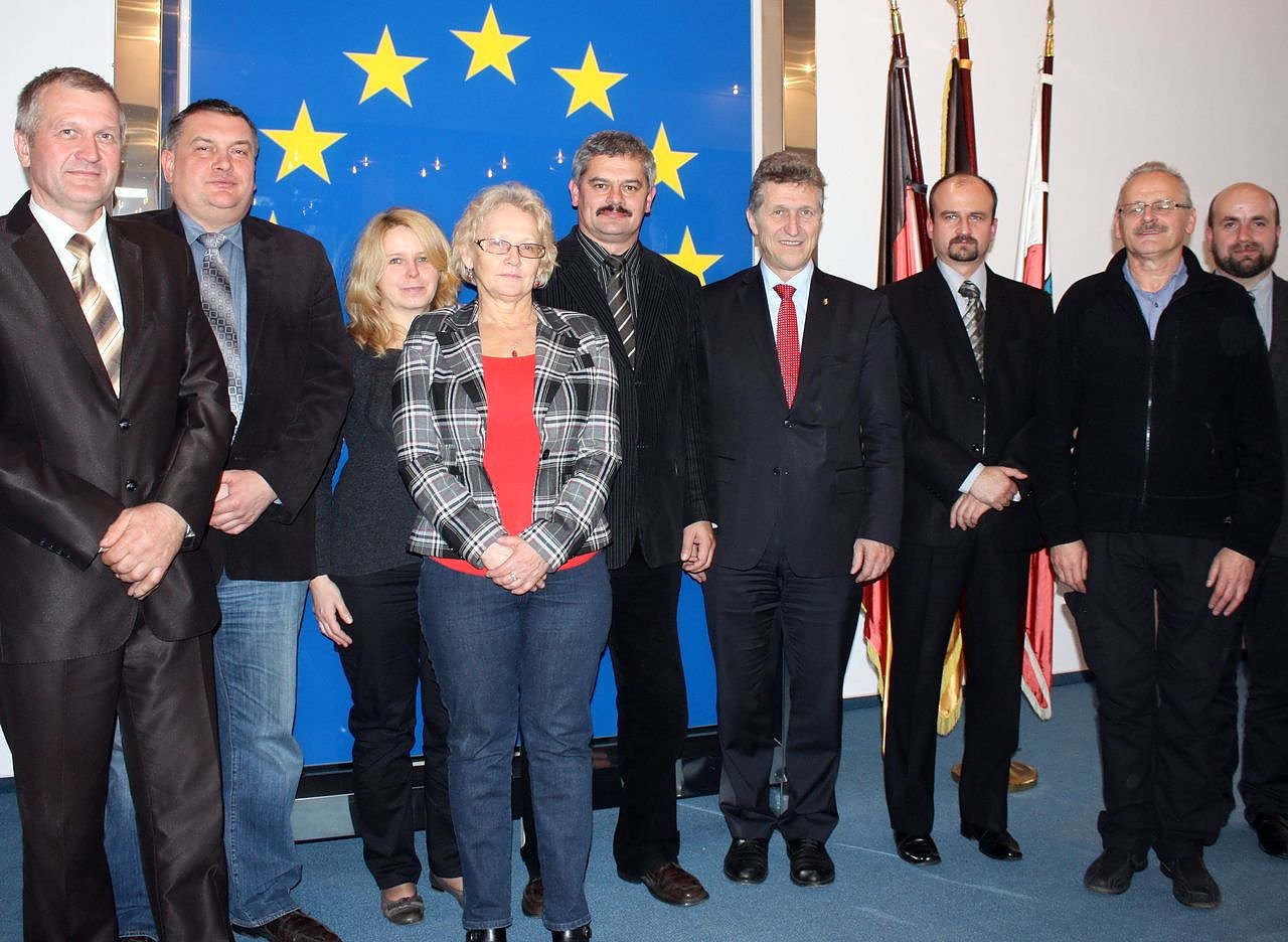 Autor: redOberbürgermeister Dr. Klaus Zeh empfing den Gemeindevorsteher von Ostrów, Piotr Cielec (5.von links), der unter anderem mit seinem Stellvertreter, der Kulturdezernentin, einem Historiker, dem Museumsleiter und dem Dorfvorsteher von Blizna anreiste.