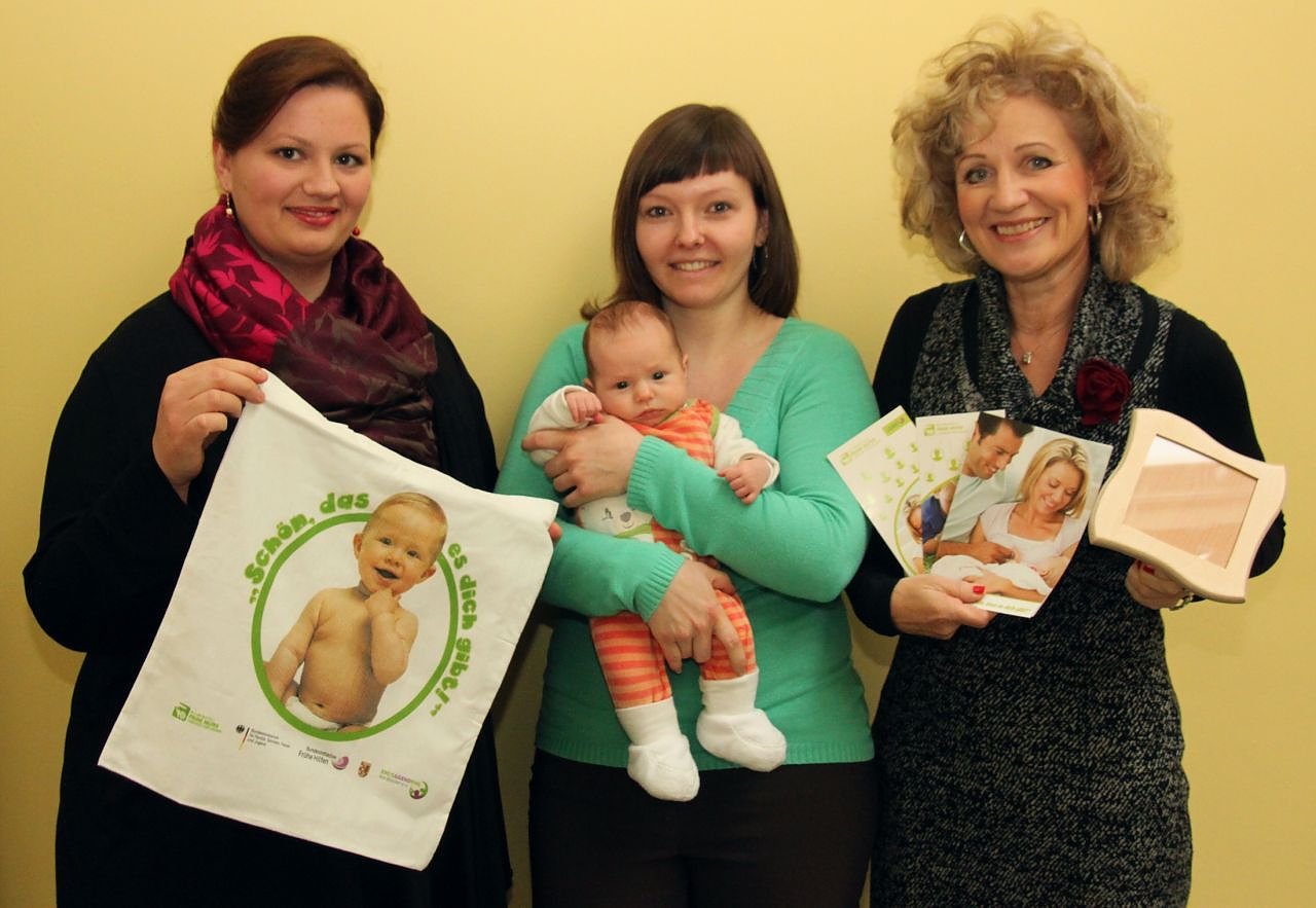Autor: redAngelika Raupach (Netzwerkkoordinatorin Frühe Hilfen) und Landrätin Keller überreichen symbolisch das erste Willkommenspaket an Mutter Anika Stiegler und ihre Tochter Paula.