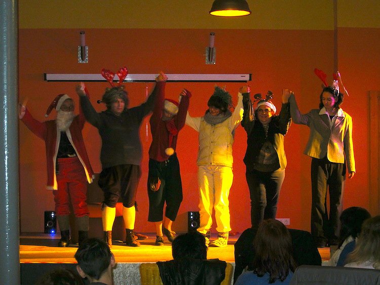 Sechs Frauen, die als Teilnehmerinnen eines Projektes (LISA) zur gesundheitlichen Stabilisierung seit mehreren Monaten in einem Wahlmodul im Theater spielen, hatten kurz entschlossen ein eigenes Stück verfasst. Der Weihnachtsmann und seine Rentiere stehen bei diesem augenzwinkernden und sozialkritischem Theaterstück im Mittelpunkt und nicht nur die Sozialpädagogen und Gäste staunten, mit welcher Spielfreude und hohem Engagement die Damen zu Werke gingen. Zwanzig Minuten lang unterhielten sie die anwesenden Frauen, Männer und vor allem Kinder mit ihrem Spiel, zu dem sie auch Bühnenbild und Kostüme selbst beigesteuert hatten. Gemeinsam mit ihrer Anleiterin Eva Maria Wiegand, die als Regisseurin viele Hilfestellungen gab, führte die Gruppe Fabelhaft schon vor einigen Wochen ein erstes vielbeachtetes Theaterprojekt auf.