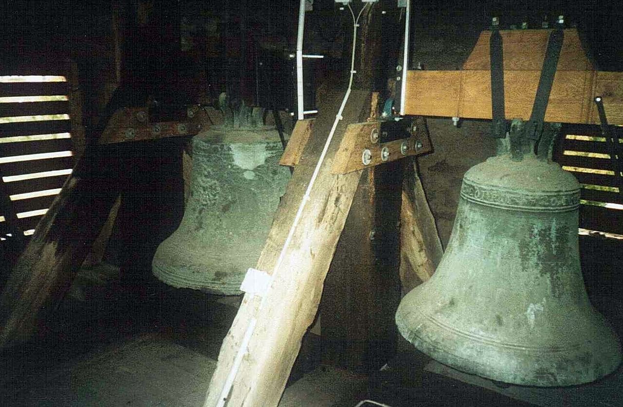 Später wurde das Langhaus angebaut und dann beides erhöht. Von Anno 1315 stammt die älteste Glocke mit einem Durchmesser von 98 cm. Sie enthält zwischen zwei Paar glatten Reifchen die die rechtsläufige Inschrift in Majuskeln (Großbuchstaben): FVSA.COPANA.ANO.DNI.MCCCXV.VII.KAL.JULII. Die Schrift lautet in der Übersetzung: Gegossen ist diese Glocke im Jahre des Herrn 1315 am Vortage der Iden des Juni. (Iden ist lateinisch und entspricht den 13. oder 15. Monatstag des altrömischen Kalenders.) Die Schrift ist linksläufig in den Mantel der Glockenform eingeritzt worden.