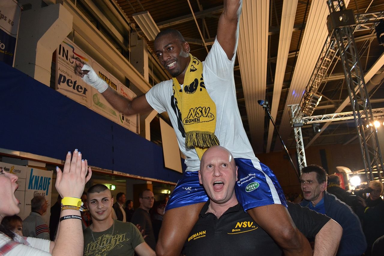 Nachdem N´tuve (Bild) gegen den ebenfalls in dieser Saison starken Enrico La Cruz ein Unentschieden errang, holte Clarence Goyeram in seinem zweiten Einsatz für Nordhausen etwas überraschend seinen ersten Sieg. Gegen den mehrmaligen Deutschen Meister Eugen Burhard riss er die über 1000 frenetisch anfeuernden Nordhäuser Fans mit und brachte die NSV-Boxer zwischenzeitlich mit 7:6 in Front.