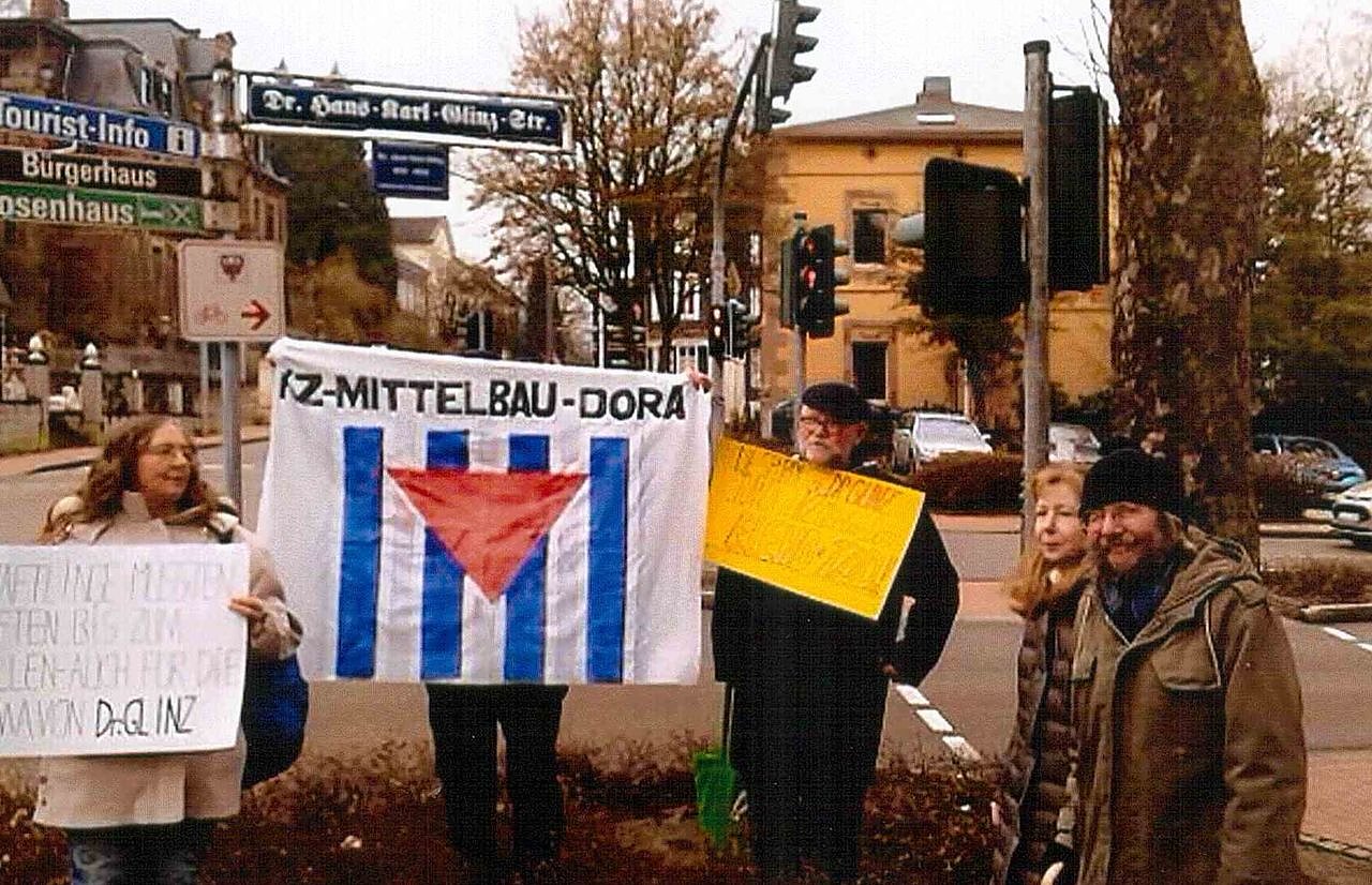 Wir protestierten am Gedenktag gegen den Straßennamen "Dr. Hans Karl Glinz Straße" und gegen das Ergänzungsschild "Dem Initiator des Verkehrstunnels", weil wir wissen, dass Dr. H. K. Glinz unter SS-General Hans Kammler im Kohnstein seine scheußlichen technischen und wissenschaftlichen Erfahrungen im Untertagestollenvortrieb sammelte und dass dabei Menschen erbarmungslos zugrunde gingen.