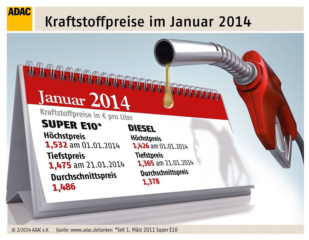Teuerster Tag zum Tanken war im Vormonat der 1. Januar: Super E10 kostete im Tagesdurchschnitt 1,532 Euro. Auch Dieselfahrer mussten am Monatsersten die höchsten Preise bezahlen. Ein Liter kostete damals durchschnittlich 1,426 Euro. Günstigster Tanktag war bei beiden Sorten der 21. Januar. Für einen Liter E10 mussten die Autofahrer im Schnitt 1,475 Euro hinlegen. Der Dieselpreis lag an diesem Tag bei 1,365 Euro.