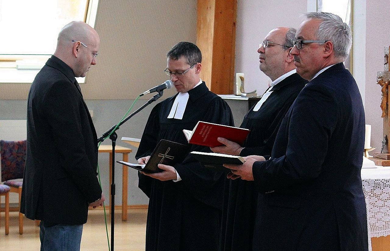 Nach vielen gut gemeinten Worten segneten Superintendent Michael Bornschein, Pfarrer Michael Blaszcyk und Dr. Wolfgang Teske den neuen Geschäftsführer in sein Amt ein.