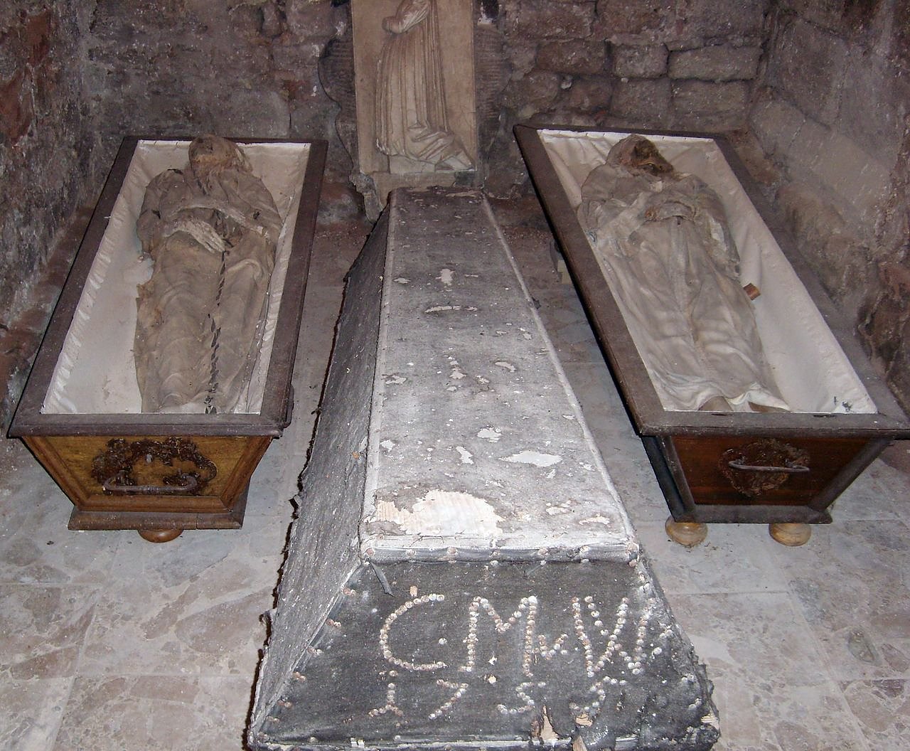 Die rechts liegende Frau lag ursprünglich in dem etwas vorgezogenen mittleren Sarg. Nach Aussage von Herrn Hans-Dieter von Wurmb, eines Nachkommen der adligen Wurmbschen Familie, handelt es sich bei dieser Verstorbenen um die am 12.02.1691 vermutlich in Rudolstadt geborenen und am 17.11.1755 in Wolkramshausen ledig verstorbenen Christiane Margarete von Wurmb, Tochter des Hofmarschalls Albrecht Anton von Wurmb.