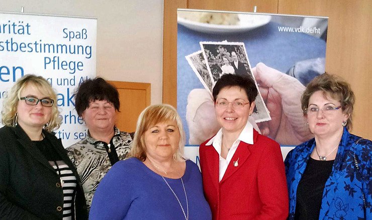 Sozialministerin Heike Taubert (SPD) zum Neujahresempfang des VdK in Erfurt mit der VdK-Bezirksgeschäftsführerin Birgit Zörkler (rechts) und ihrer Mitarbeiterin Doreen Berner-Ose (links) sowie Ramona Bräuer und Anneliese Hoffmann vom Ortsverband Nordhausen.