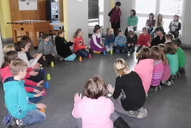Mit einer Becher-Percussion auf die richtige Fährte geschickt erkundeten die Kleinen ohne Angst ihr zukünftiges Schulhaus und lernten schon einige Lehrer, neue Mitschüler und vor allem die teilweise verwirrenden Flure kennen.