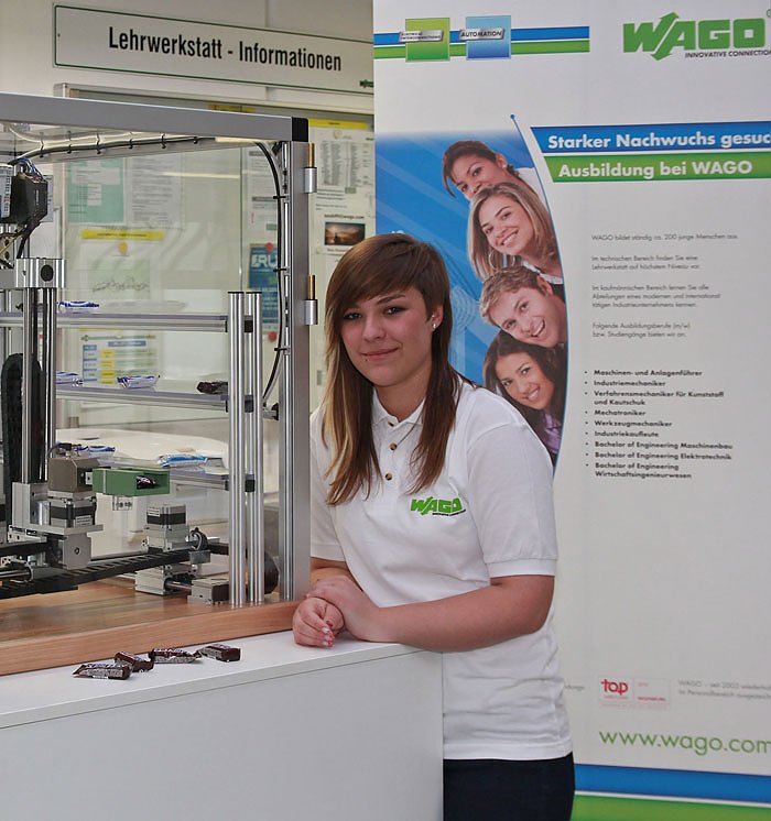 Michelle Brückner hat gerade bei WAGO ihre Ausbildung als Technische Zeichnerin für Maschinen- und Anlagentechnik beendet und freut sich schon darauf, den Schülerinnen und Schülern Rede und Antwort zu stehen: Für Technikbegeisterte bietet WAGO vielfältige Ausbildungsmöglichkeiten in einer hochmodernen Lehrwerkstatt und mit einer tollen Betreuung durch das Ausbildungs-Team, weiß die 20-Jährige, die nun in der Betriebsmittelkonstruktion angestellt ist.