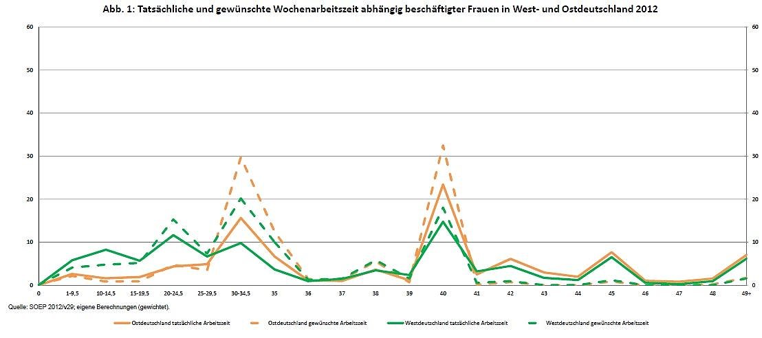 In Ostdeutschland liegen ihre durchschnittlichen Arbeitszeitwünsche um mehr als sieben Stunden und ihre tatsächlich geleisteten Wochenarbeitszeit rund zehn Stunden über den Werten in Westdeutschland.
