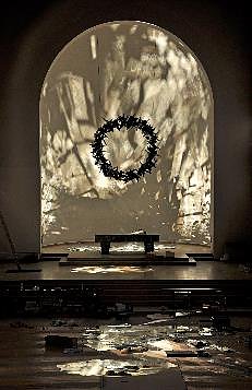 Umso größer nun die Freude über den Dank von Frau Dicke und die Übersendung der abgebildeten Installation in der Kirche Christ König in Bochum. Im Innenraum der Kirche sind die zerbrochenen Spiegel zu großen Mosaiken zusammen gefügt. Aus Scheinwerfern fällt strukturiertes Licht als leuchtende Schrift und abstrakte Zeichen darauf. Aus nicht mehr verwertbarem Ausschuss lässt die Rauminstallation fragile leuchtende Kristallstrukturen und Prismen entstehen, die die Kirche mit Lichtspiegelungen füllen.