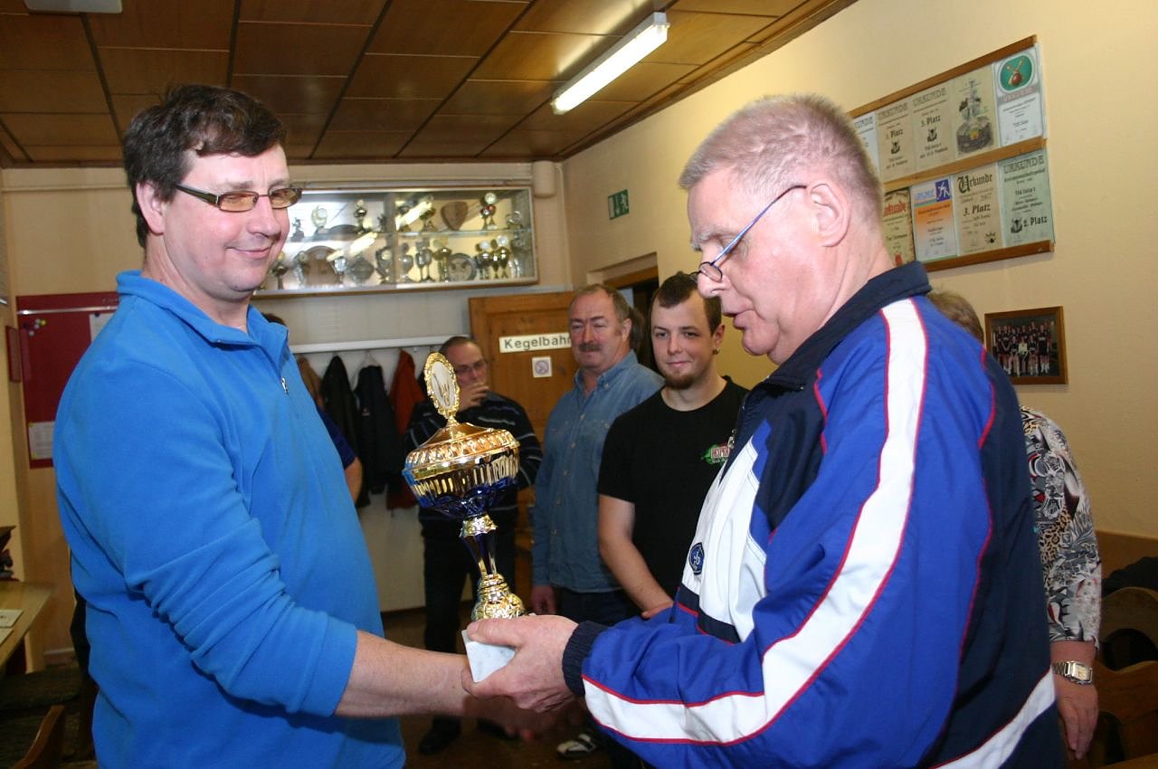 SG Bleicherode/Sollstedt III – KSV Handwerk Nordhausen 4:2 (1974:1877/9:7)Herzliche Gratulation von Kreiskegelspielwart Rainer Krätzschel (rechts) an Bernd Grimm, Mannschaftsleiter der 3. Mannschaft der SG Bleicherode/Sollstedt, zum Gewinn des Kreispokals.