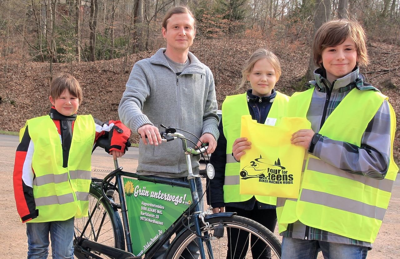 Autor: redBündnis 90/Die Grünen-Sprecher Christian Darr mit Vincent, Daria und Benedikt (v.l.). Sie haben die gespendeten Sicherheitswesten im Namen der Teilnehmer an der Tour for Teens entgegengenommen.