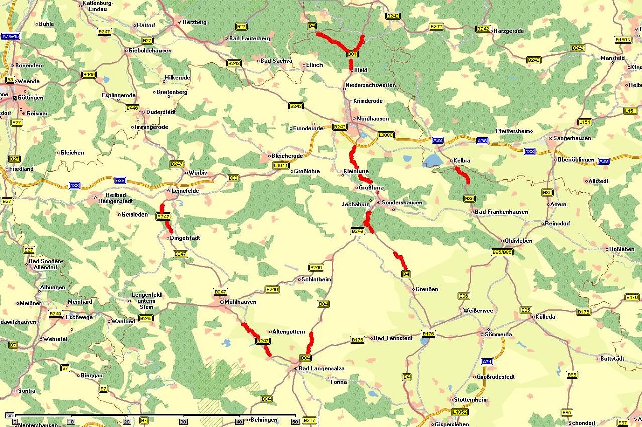 - B 4 und B 81, zwischen den Landesgrenzen Niedersachen sowie Sachsen-Anhalt und Thüringen bis Ilfeld, weiter B 4 Nordhausen und Abzweig Hain, Neuheide und Sondershausen, Sondershausen/Graß, zwischen Abzweig Obertopfstedt und Abzweig Wasserthalleben