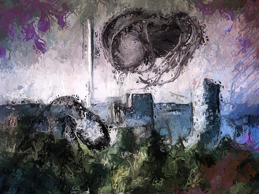 Während die Bilder im Laufe des Abends durch die Hände bzw. über die Tablets der Künstler wandeln, werden sie zum Teil krass ummodelliert. Das Luftbild Ostrows explodiert in einem rotgrünem Kaleidoskop, über Bochum tummeln sich Seemonster, der Roland bekommt einen kleinen Bruder und der Himmel über Steyr färbt sich violett.
