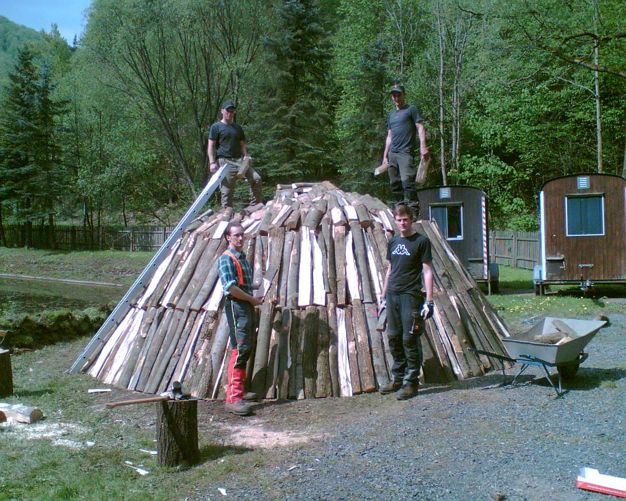 Ein historischer Erdmeiler wurde errichtet. Die benötigten 25 Raummeter Buchen- und Eschenmeterscheite kamen aus dem Forstrevier Rothesütte. Hartlaubholz gleicher Güte, wird für eine gleichmäßigen Kohlprozess und Holzkohle höchster Güte verwendet. Zum Aufbau des Erdmeilers: Am Anfang steht die Herrichtung des Meilerplatzes und der Meilerplatte. Anschließend wird ein sogenannter Quandelschacht, ein zwei Meter hoher im Zentrum befindlicher Schacht. Der anschließend mit leicht brennbaren Astmaterial und trocknen Buchenstücken gefüllt wird und dem späteren Anzünden dient. Dicht an dicht stapeln die jungen Auszubildenden die vorbereiteten Holzscheite an den Quandelschacht, bis sich ein halbkugelförmiger Aufbau ergibt.