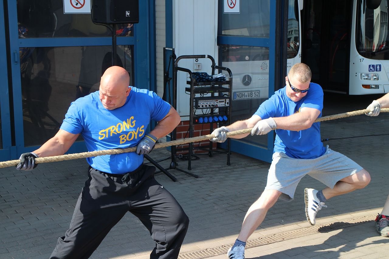 Noch vor der offiziellen Eröffnung begann der Wettbewerb im Linienbus-Ziehen. Zwölf Tonnen wollen von maximal fünf Mann über 25 Meter gezogen werden. Bisherige Bestzeit heute: knapp 18 Sekunden. Aber nicht nur Muskelbepackte Männer können antreten. Dem Aufruf von Gabriele Schuchardt, Geschäftsführerin der Verkehrsbetriebe und Landrätin Birgit Keller eine Damenmannschaft zu bilden, folgten elf Frauen. Entgegen der Regeln für die Herren durften die Damen alle an einem Strang ziehen und lagen mit etwas mehr als 20 Sekunden nur knapp hinter den Herren. Bis 13 Uhr können sich noch Mannschaften anmelden.