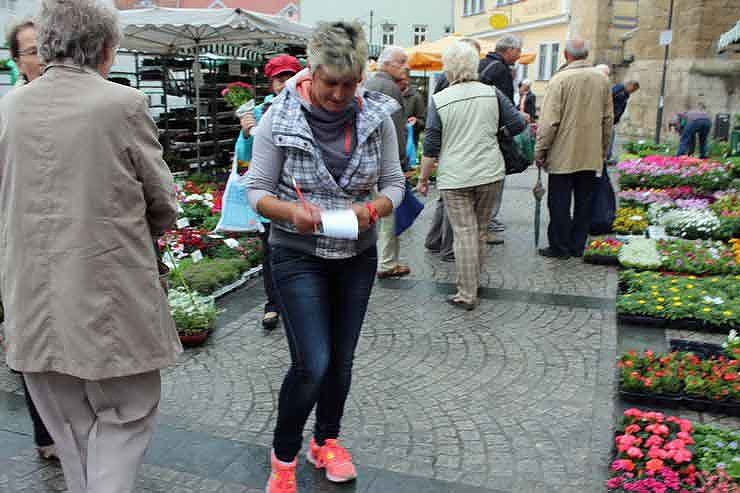 Zwischen durch verteilten die beiden Blumenmädchen Blumen auf dem Markt und trafen dabei auch auf die Chefin vom Ganzen, Marktmeisterin Heidrun Heise-Schinköth.