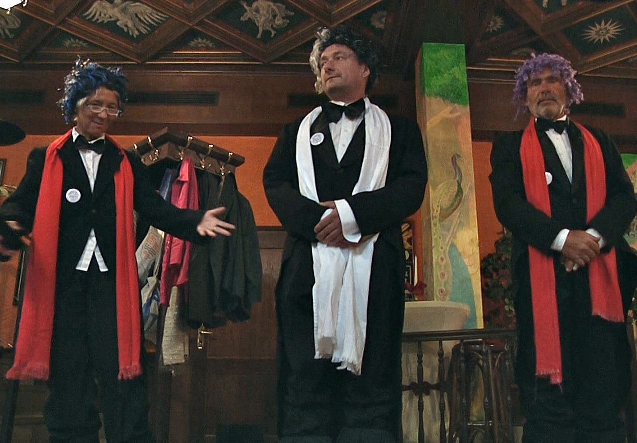 Autor: redFrack, langer Schal, Perücke, weißes Hemd und Fliege sind das Markenzeichen der Drei Tenöre. Von links: Edith Junker, Andreas Rzehak und Dietmar Junker bei einem Auftritt anlässlich einer goldenen Hochzeit im Ratskeller Nordhausen.
