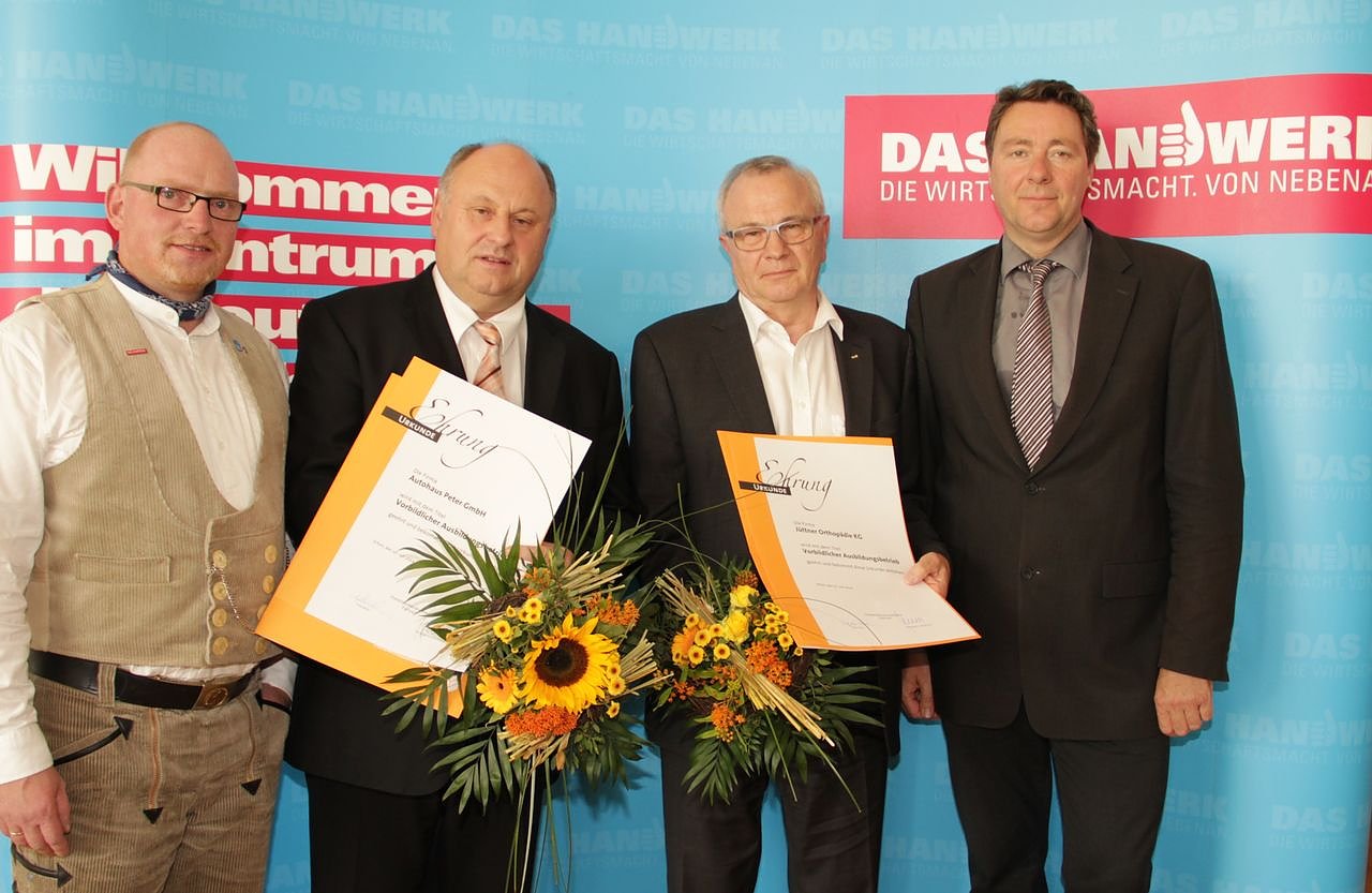 Auszeichnung als Vorbildlicher Ausbildungsbetrieb: Von links: Thomas Erdmann (HWK), GF Helmut Peter (Autohaus Peter), GF Frank Jüttner (Orthopädie KG) und Prof. Dr. Michael Behr (Ministerium AWT).