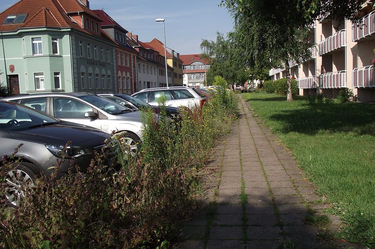 In der Justus-Jonas-Straße hingegen läuft keiner Gefahr, von einem herabstürzenden Ast erschlagen zu werden. Hier entsteht zur Zeit entlang des Bürgersteiges neben den Wohnblocks der städtischen Wohnungsbaugesellschaft (SWG) ein Unkrautgürtel besonderer Art. Als Schutz für die dort parkenden Autos oder als markante Abgrenzung zum Trottoire?