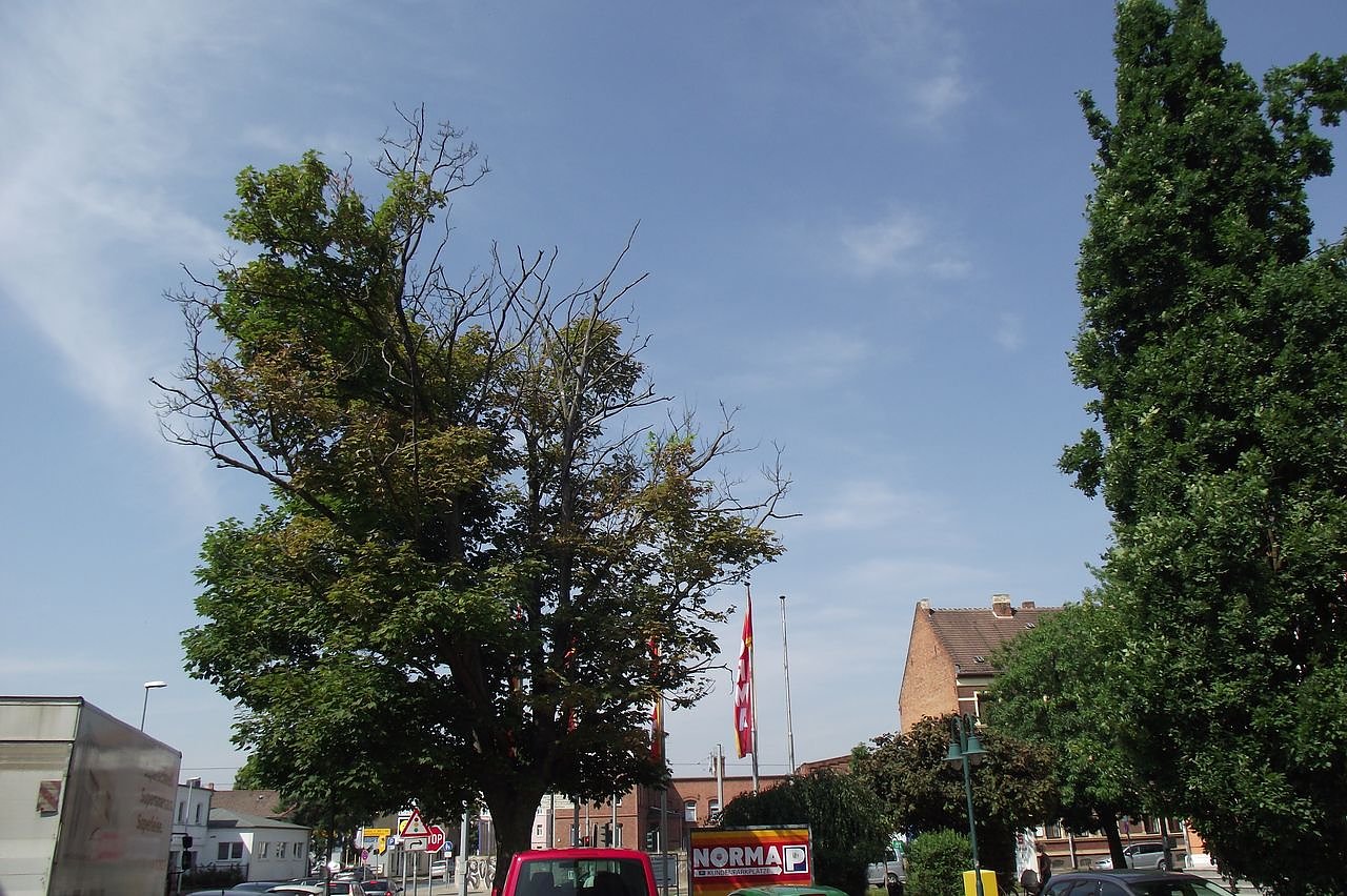 Der alte Baum steht neben einem Parkplatz. Gut belegt ist er. Wenige Schritte nur bis zur Sparkasse, dem Norma-Markt oder Bäcker. Hunderte Menschen passieren ihn täglich. Kinder suchen Schatten unter seiner noch grünenden Seite.