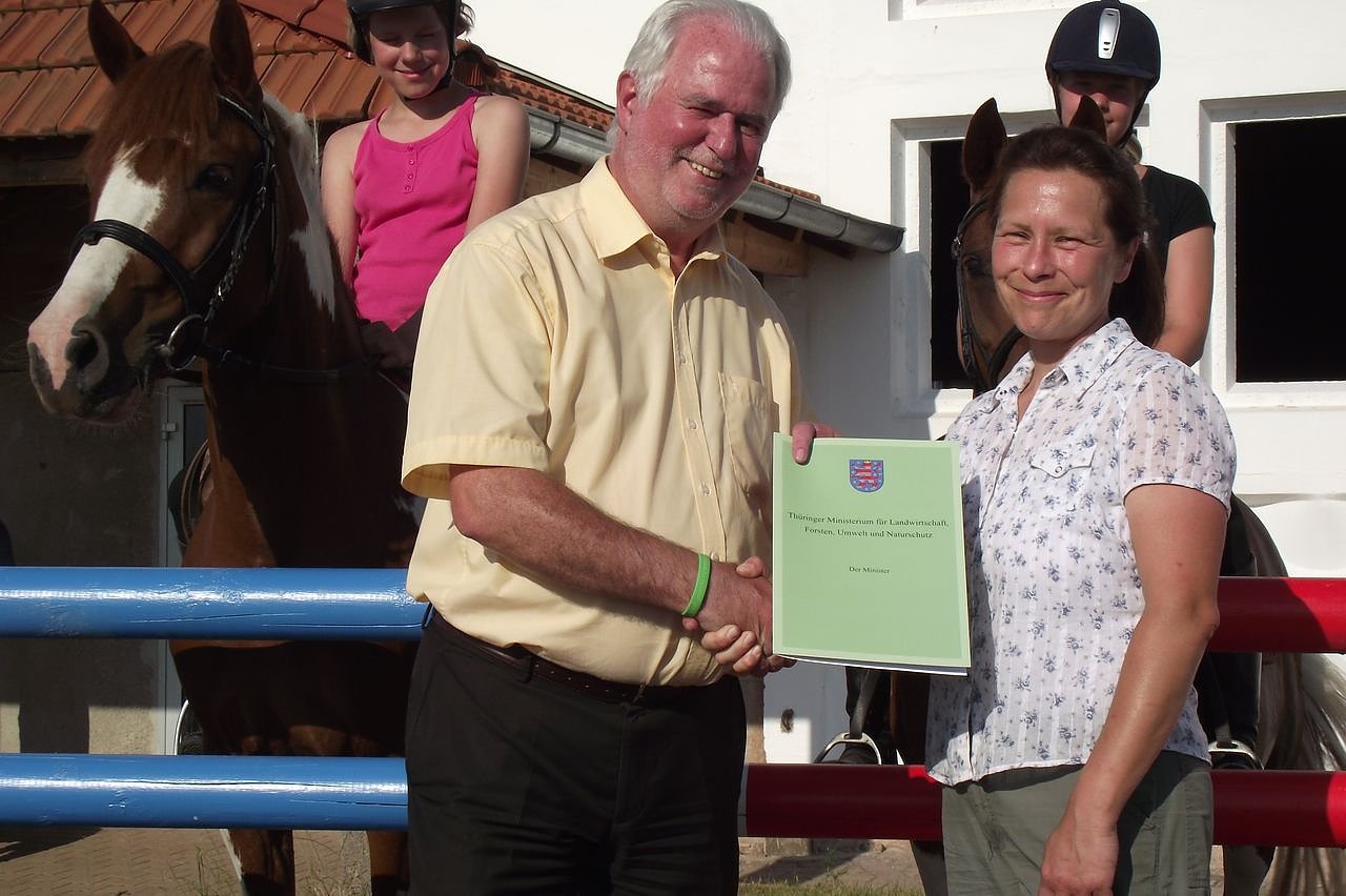 Wer den Weg zur Farm nicht fand, war der Schirmherr. Der wohnt in Nordhausen und ist Thüringens Minister für Umwelt, Landwirtschaft und Forsten. Jürgen Reinholz ist von Berufswegen viel beschäftigt. Nicht alle Termine kann er wahrnehmen. Aber: Er sei, war zu hören, dem Pferdesport sehr verbunden. Immerhin habe er auf dem Rücken der edlen Tiere gesessen – in der BSG Medizin, Sektion Pferdesport.