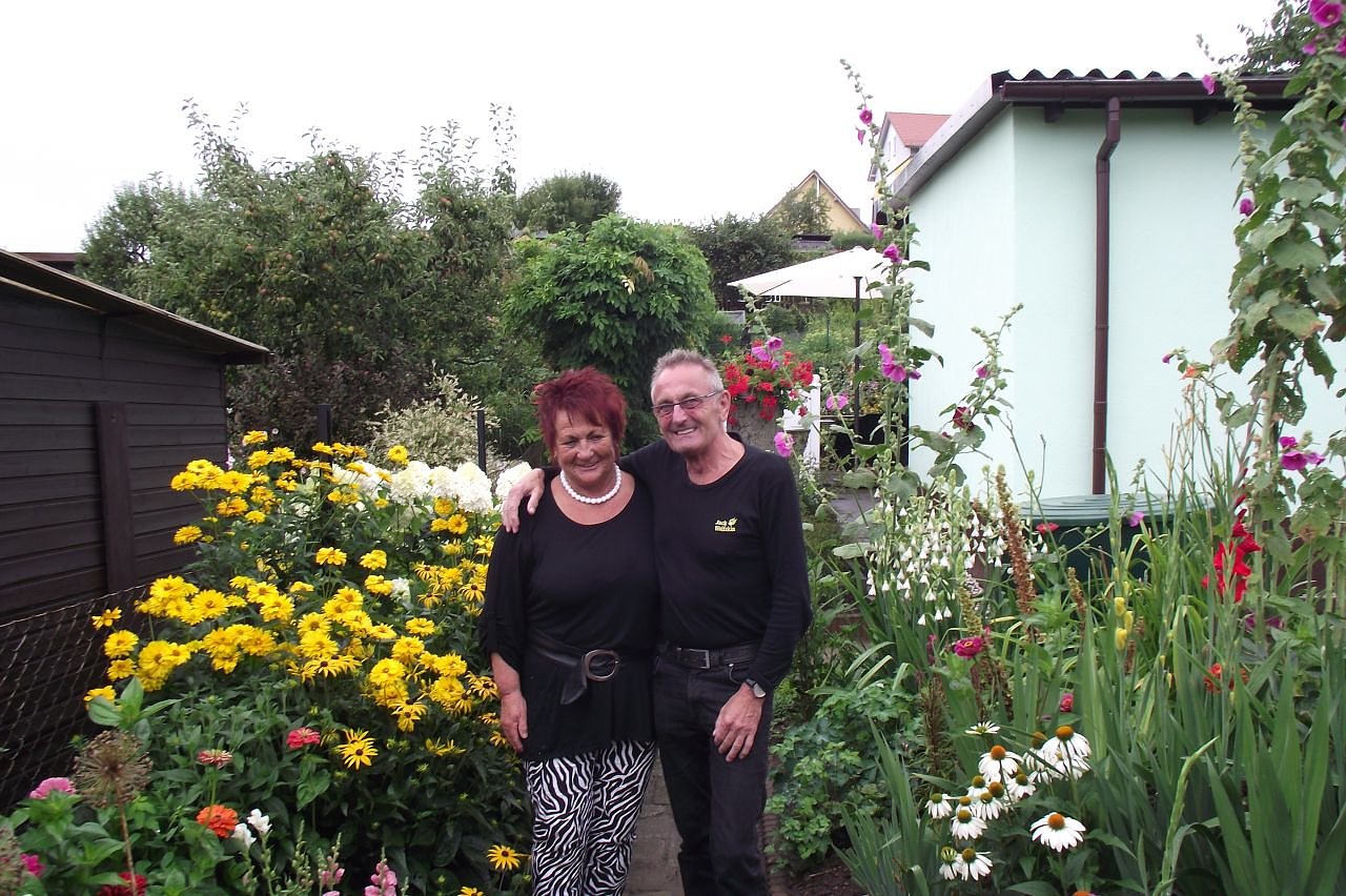 Heinz und Heidi Beck zwischen der Blumenpracht in ihrem Garten der Anlage Borntal in Nordhausen. Hier fühlen sie sich wohl, erholen und entspannen sich, erleben die Natur in all ihren Facetten. (Foto: Kurt Frank)