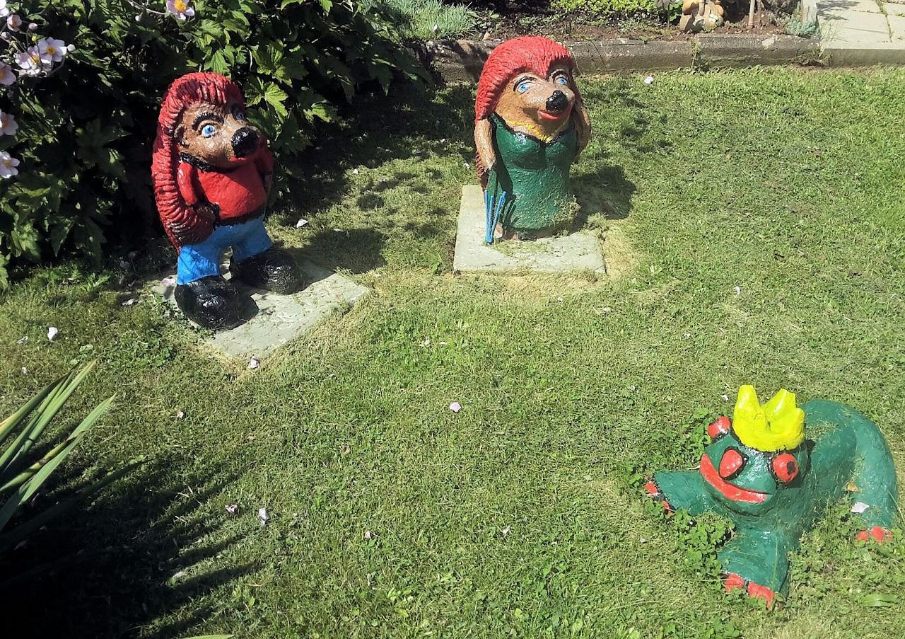Autor: redDiese aus Beton bestehenden Figuren, wurden in Handarbeit von der Besitzerin und ihrem damaligen Mann erbaut. Sie haben eine Größe von einem 1,30 Meter.
