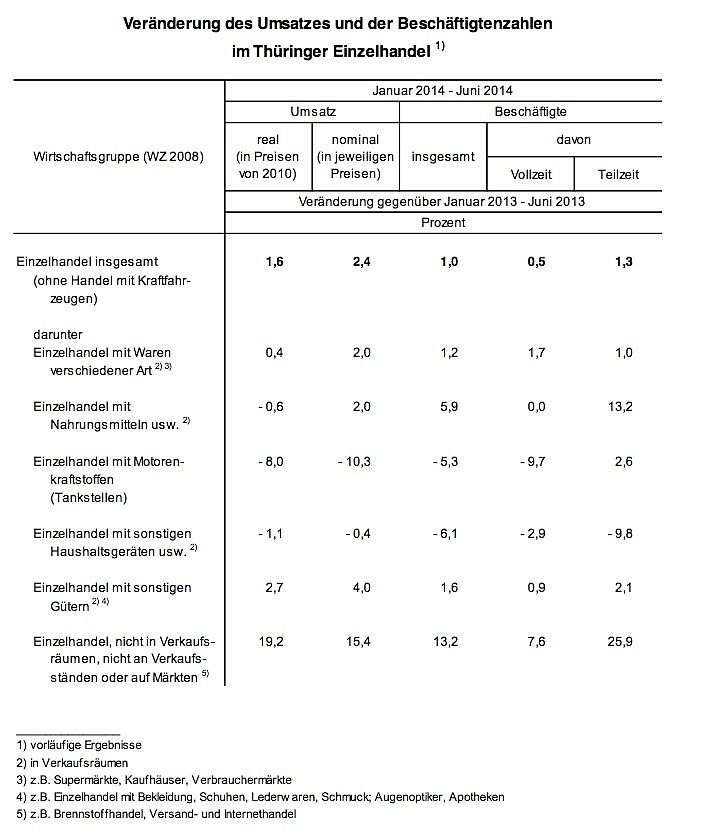 Die Thüringer Einzelhändler setzten nach vorläufigen Ergebnissen des Thüringer Landesamtes für Statistik im 1. Halbjahr 2014 real (preisbereinigt) 1,6 Prozent und nominal (zu jeweiligen Preisen) 2,4 Prozent mehr um als im gleichen Zeitraum des Vorjahres. Das Beschäftigungsniveau änderte sich im 1. Halbjahr 2014 nur unwesentlich.