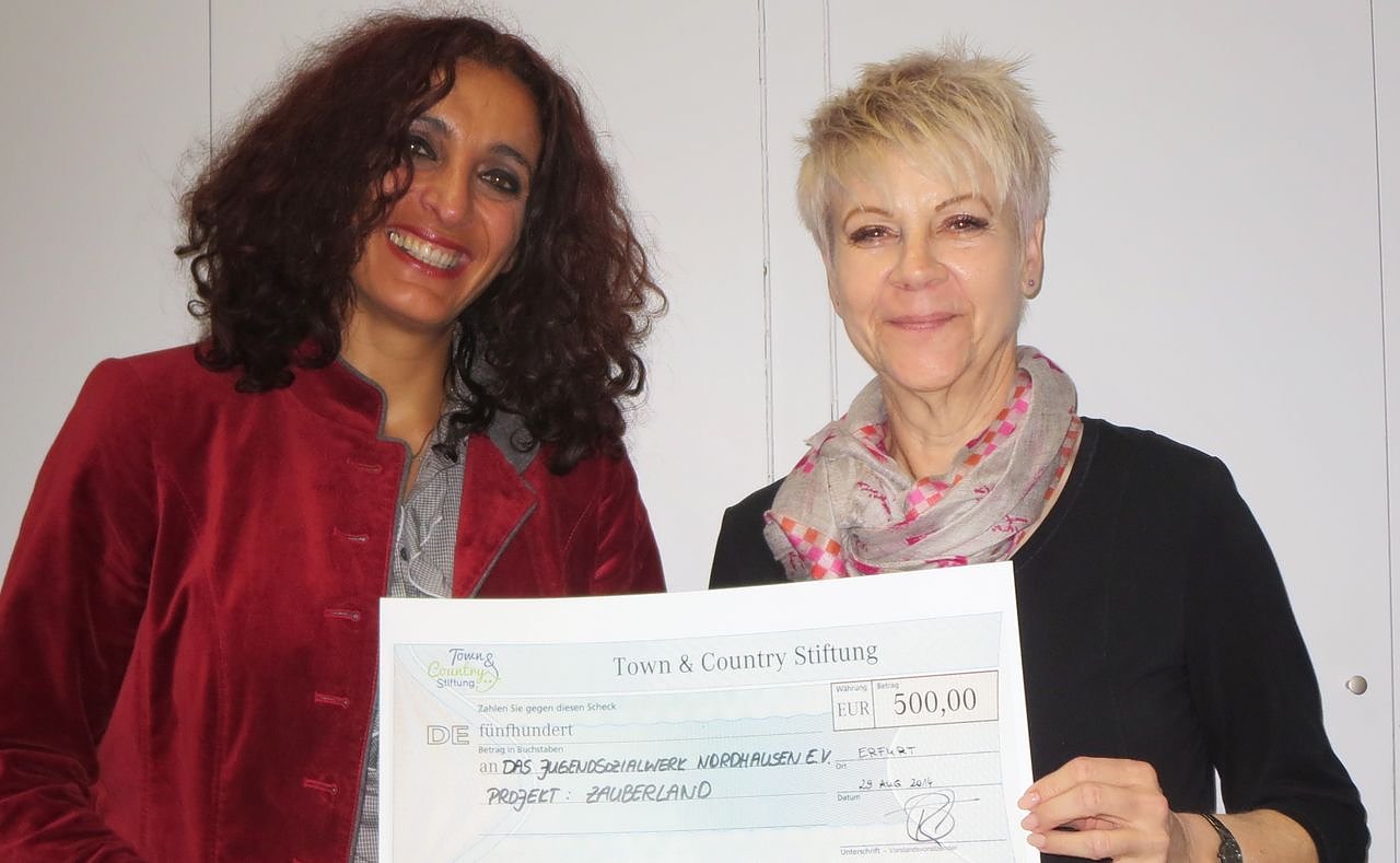 Im Rahmen des 2. Town & Country Stiftungspreises überreicht Rosemarie Schmack-Siebenlist-Hinkel, Kuratorin der Stiftung FamilienSinn und Botschafterin der Town & Country Stiftung, am Freitag einen Scheck in Höhe von 500 Euro an Vivian Grabe vom Jugendsozialwerk Nordhausen für das Projekt Zauberland.