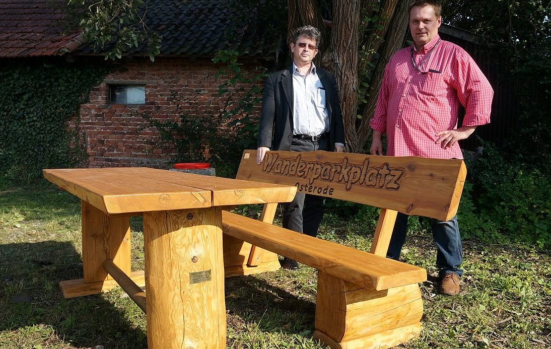 Der Neustädter Thomas Kühn übergab heute an Bürgermeister Dirk Erfurt eine neue Sitzgruppe für den Wanderparkplatz in Osterode. Für den guten Zweck wollte sich der Inhaber der Firma Schnapper Zacker engagieren und stiftete zwei Bänke und einen Tisch im Wert von rund 450 Euro.