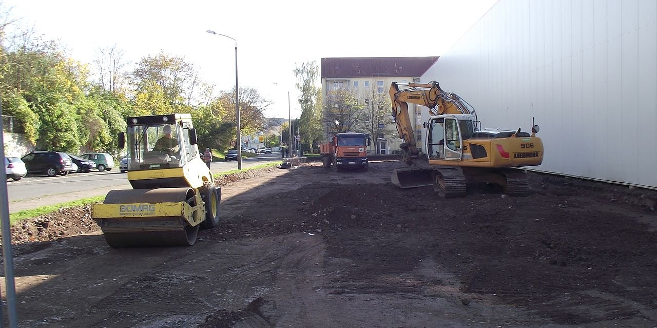 Erdarbeiten für den Parkplatz des künftigen Getränkemarktes. Im Hintergrund das Wohngebäude in der Flickengasse.