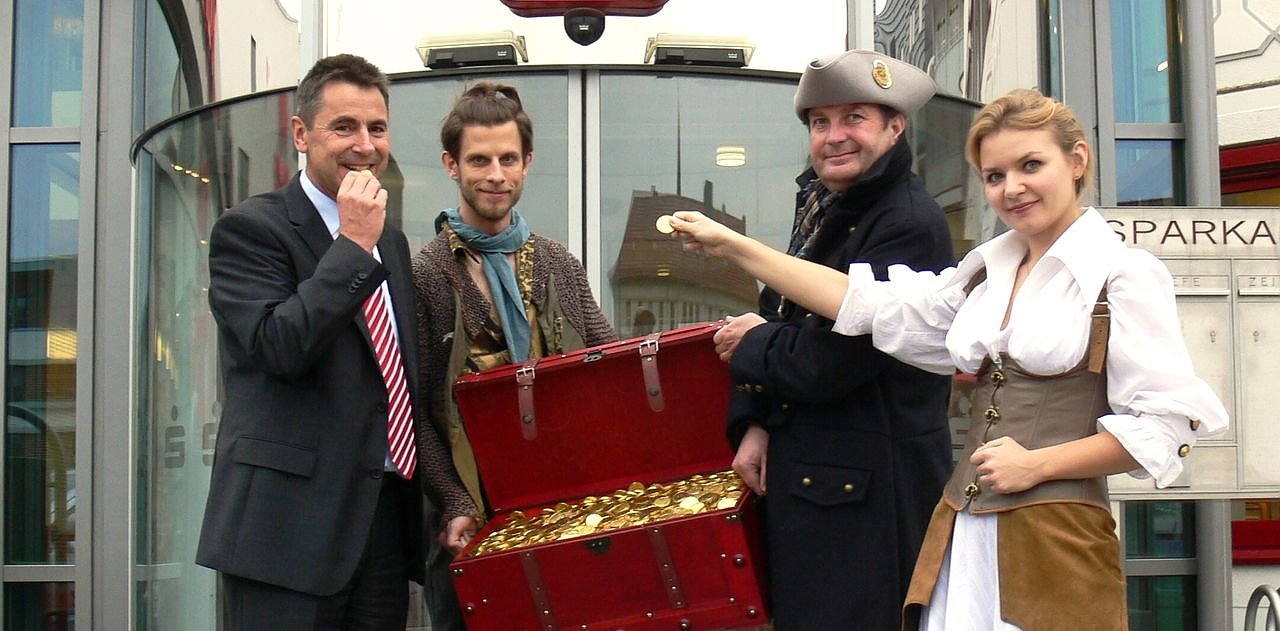 Und so wird nun die Bevölkerung um Mithilfe gebeten: Schätzen Sie die Anzahl der Goldtaler in der Schatzkiste, die im Eingangsbereich der Kreissparkasse Nordhausen aufgestellt ist! Unter allen Teilnehmern werden 3x2 Karten für die Operette Die Banditen im Theater Nordhausen verlost, und der beste Schätzer bekommt zu seinen Ehrenkarten den gesamten Schatz obendrein!