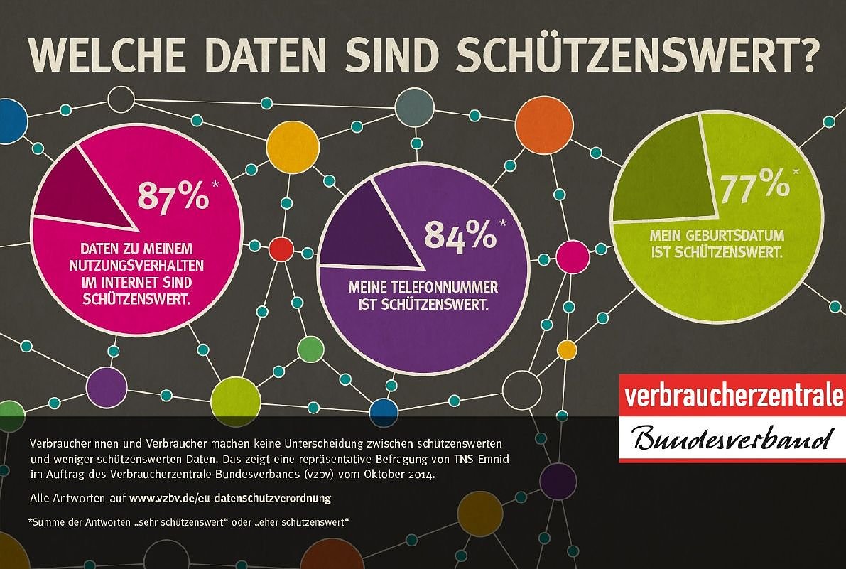 Eine aktuelle repräsentative Umfrage von TNS Emnid im Auftrag des vzbv unterstützt diese Forderung: Verbraucher treffen keine grundsätzliche Unterscheidung zwischen besonders schützenswerten und vermeintlich belanglosen persönlichen Daten. Ob das Geburtsdatum (77 Prozent), Fotos von sich selbst (78 Prozent) oder Videos von Familie und Freunden (82 Prozent): Eine große Mehrheit der Befragten beurteilt diese Daten als sehr oder eher schützenswert. Besonders sensibel sind Internetnutzer, sobald es um Daten zu ihrem Nutzungsverhalten im Internet geht (87 Prozent). Insgesamt bewerten drei Viertel (78 Prozent) der Bundesbürger den Einfluss des Internets auf ihr Leben als positiv. Fast ebenso viele (76 Prozent) sehen aber auch Defizite beim Datenschutz.