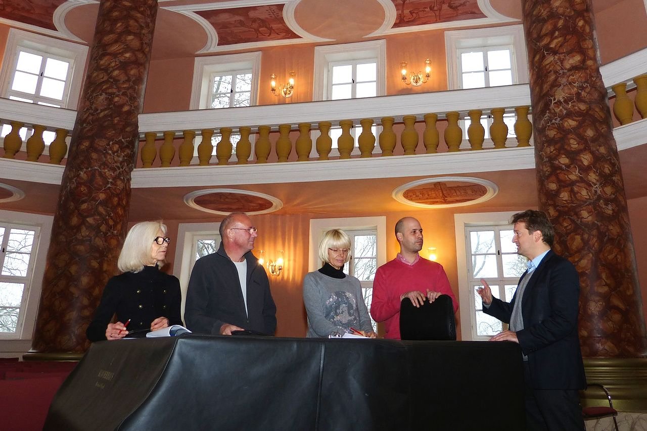 Und so gab es bereits eine Begehung im Schloss, bei der Intendant Lars Tietje, Verwaltungsdirektorin Angela Kalms, der Technische Direktor Jürgen Bley und Ausstatterin Elisabeth Stolze-Bley vom Theater Nordhausen mit Caterer Carsten Tettenborn vom Schacht 5 Einzelheiten besprachen.