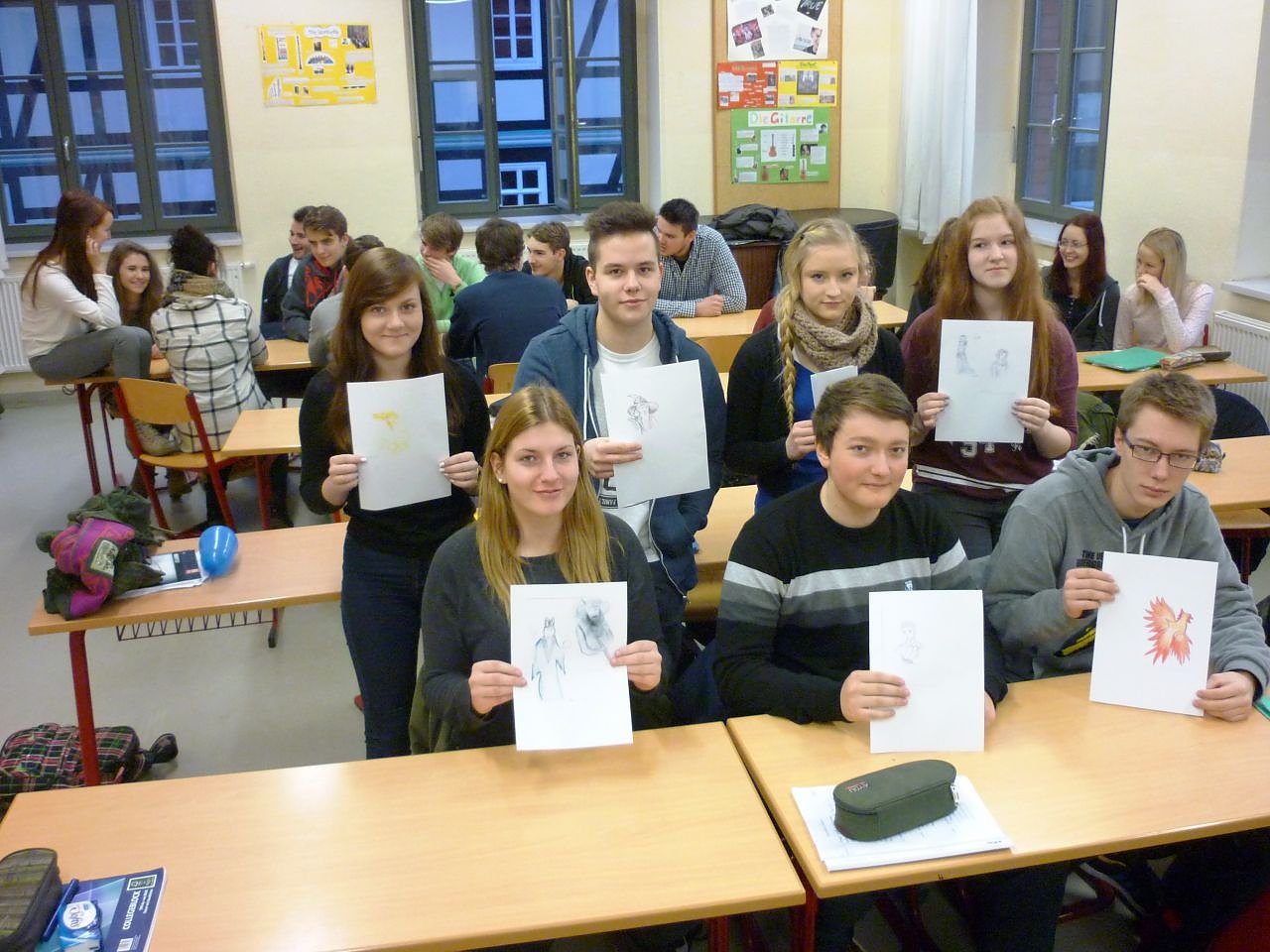 Die Arbeitsgruppen des Musikkurses 11, im Vordergrund Schülerinnen und Schüler mit Zeichnungen zu Strawinskys Ballett Der Feuervogel (Foto: Juliane Hirschmann)