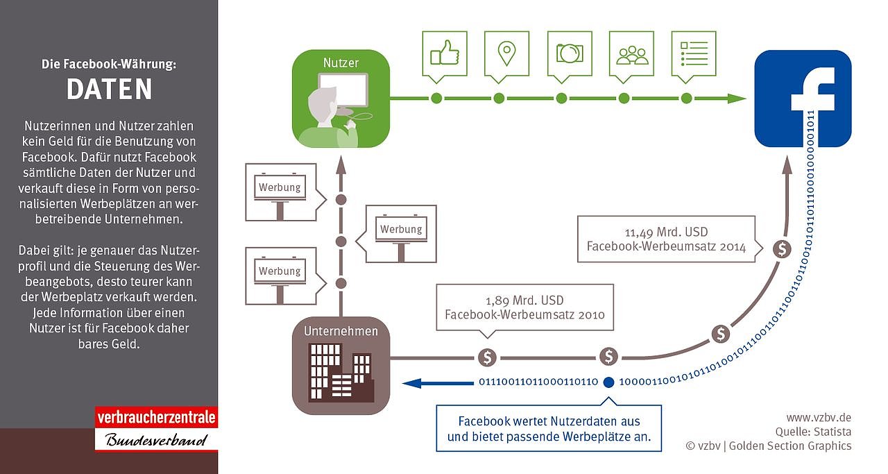 Nutzerinnen und Nutzer zahlen kein Geld für Facebook. Aber Facebook verdient Milliarden Dollar pro Jahr, indem es sämtliche Daten der Nutzer auswertet und diese in Form von personalisierten Werbeplätzen an werbetreibende Unternehmen verkauft. Persönliche Daten werden damit zur Facebook-Währung, auf der das Geschäftsmodell basiert, sagt Klaus Müller, Vorstand des vzbv. Von 2010 bis 2014 konnte Facebook seine Werbeumsätze von 1,88 Milliarden US-Dollar auf 11,49 Milliarden US-Dollar steigern.