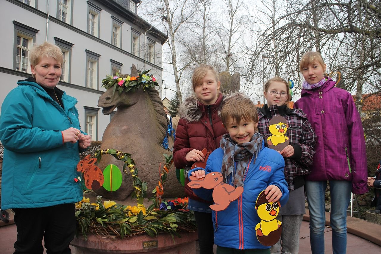 Der Schmuck am Meerpferd und den sechs anderen Brunnen soll bis Ostern das Auge erfreuen. Da das Fest aber noch einen Monat auf sich warten lässt, haben die jungen Gestalter auf langlebiges Grün und auch künstliche Imitate gesetzt. Das Ergebnis kann sich sehen lassen und wird hoffentlich auch in einem Monat noch so gut aussehen, wie heute.