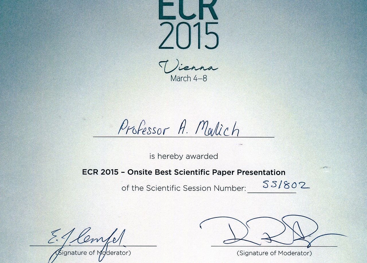 Prof. Malich wurde während des Europäischen Röntgenkongresses für die Präsentation über die computerassistierten Diagnosesysteme für die beste wissenschaftliche Präsentation ausgezeichnet.